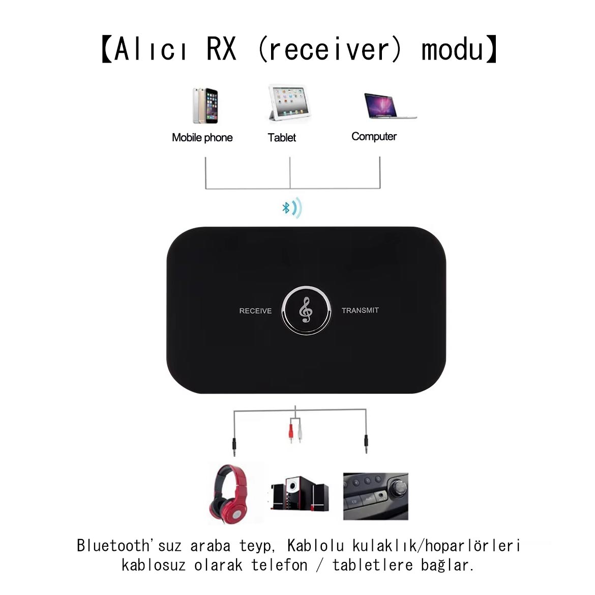 - 【Alıcı RX (receiver) modu】Bluetooth'suz araba teyp, Kablolu kulaklık/hoparlörleri, kablosuz olarak telefon / tabletlere bağlar.