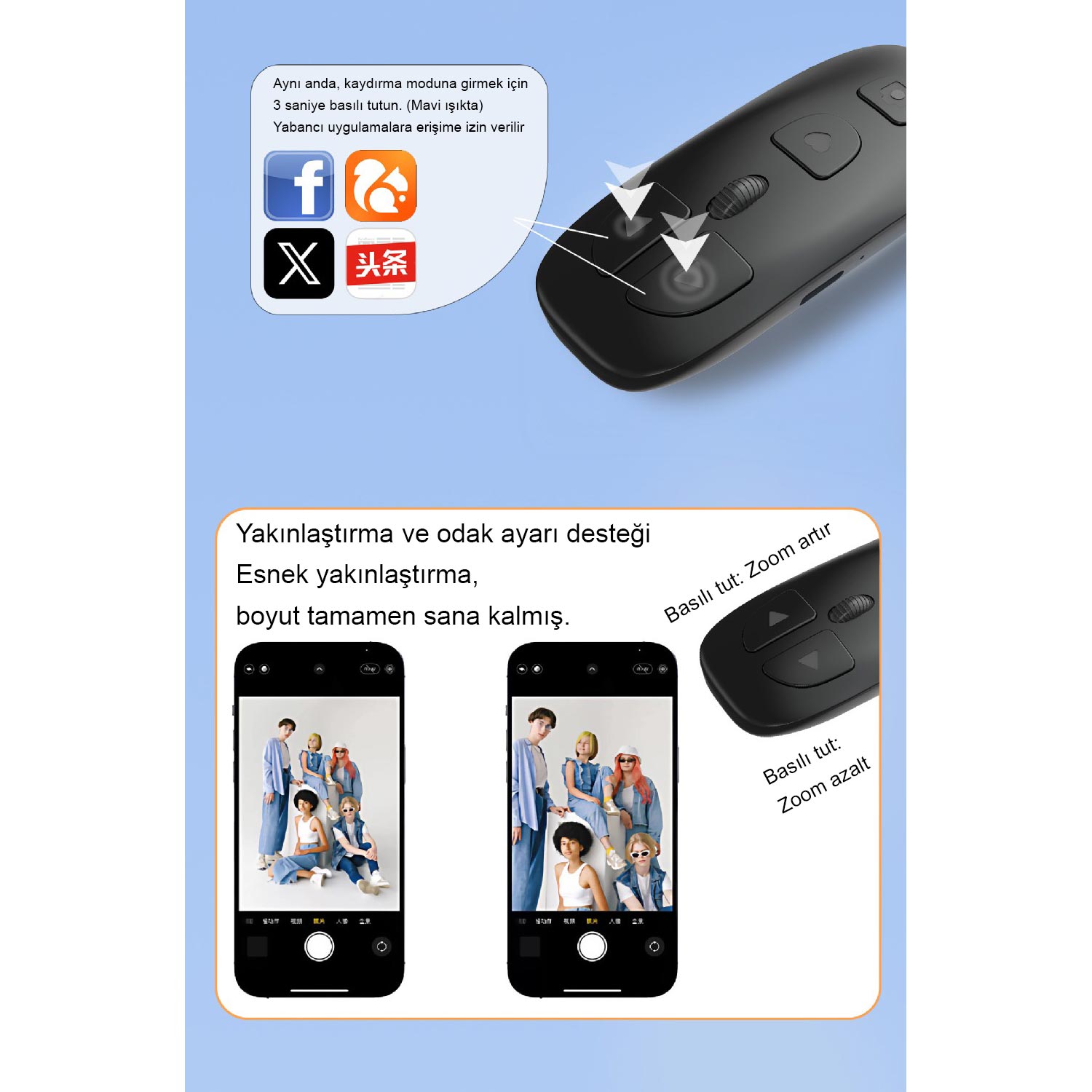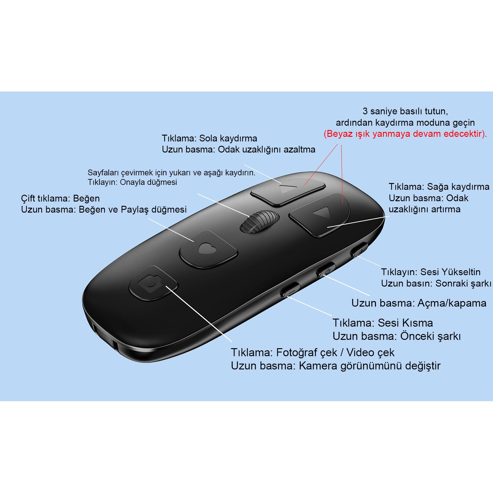 - ✅【Fonksiyonlar】Beğen ve paylaş butonu, Sayfaları aşağı yukarı çevirme ve onaylama, sola/sağa kaydırma, zoom yakınlaştırma/uzaklaştırma yapma, Müzik sesi kısıp/açma, sonraki/önceki şarkı, Fotoğraf, video çekme deklanşörü, ön arka kamera değiştirme.